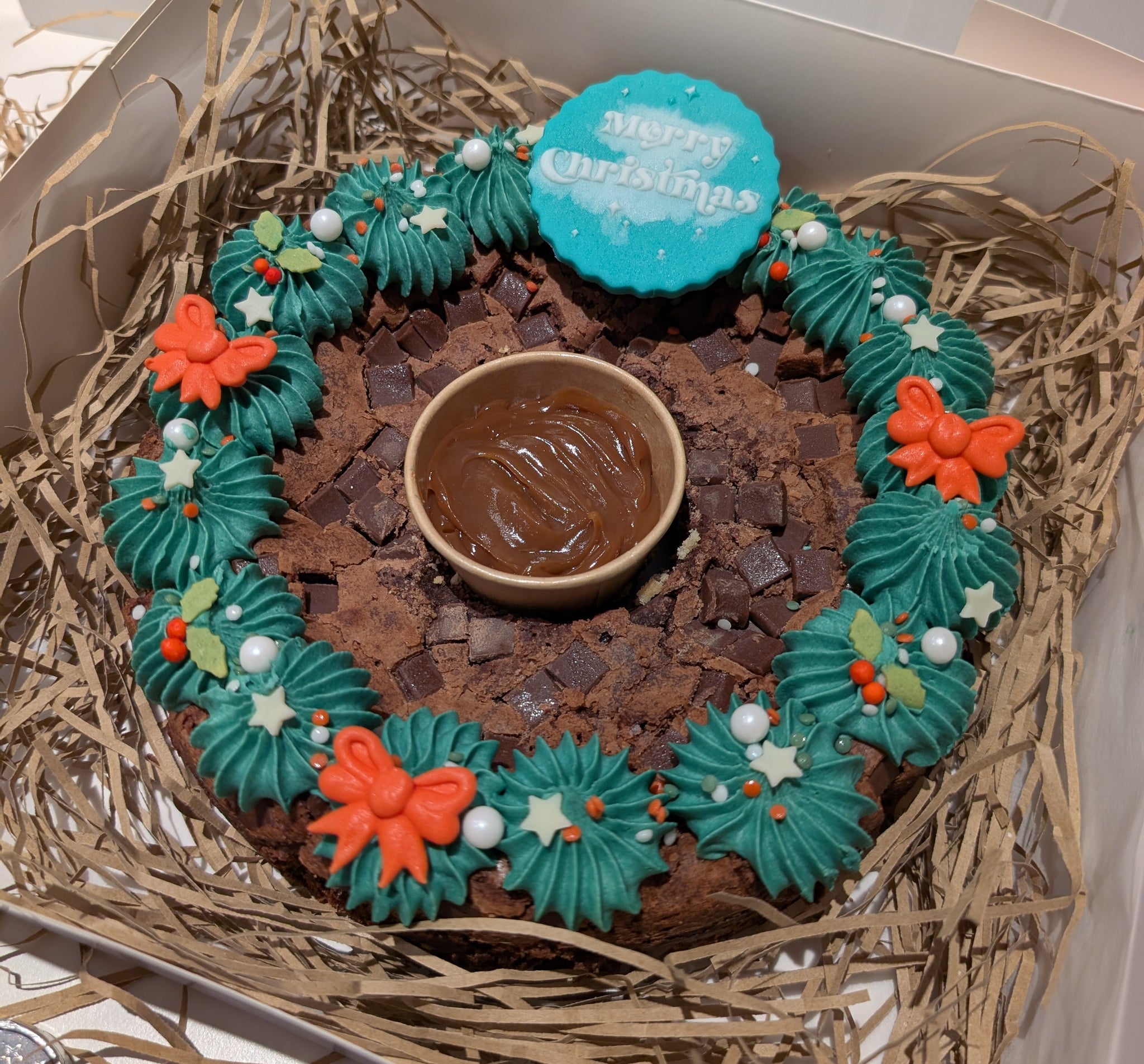 All wreaths are 8" and serve atleast 8 people. Decorated with vanilla buttercream, edible decoration & your choice of dipping pot. Finished with a "Merry Christmas" fondant disc.